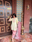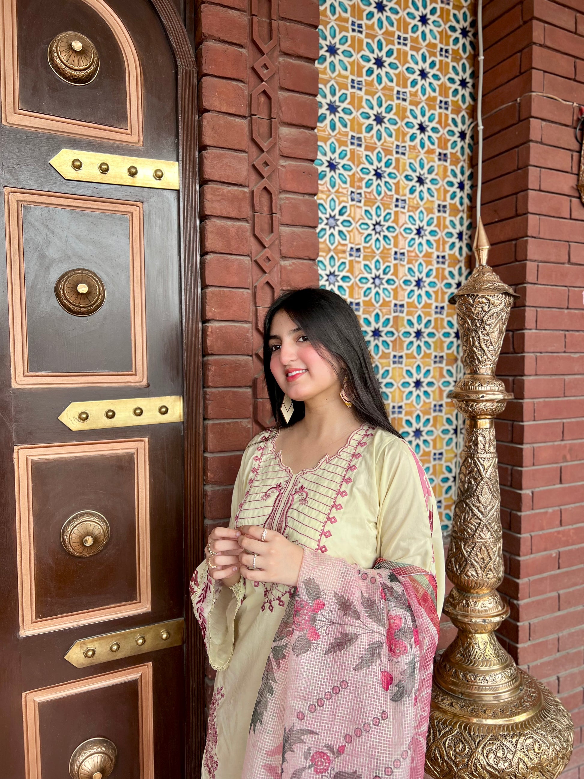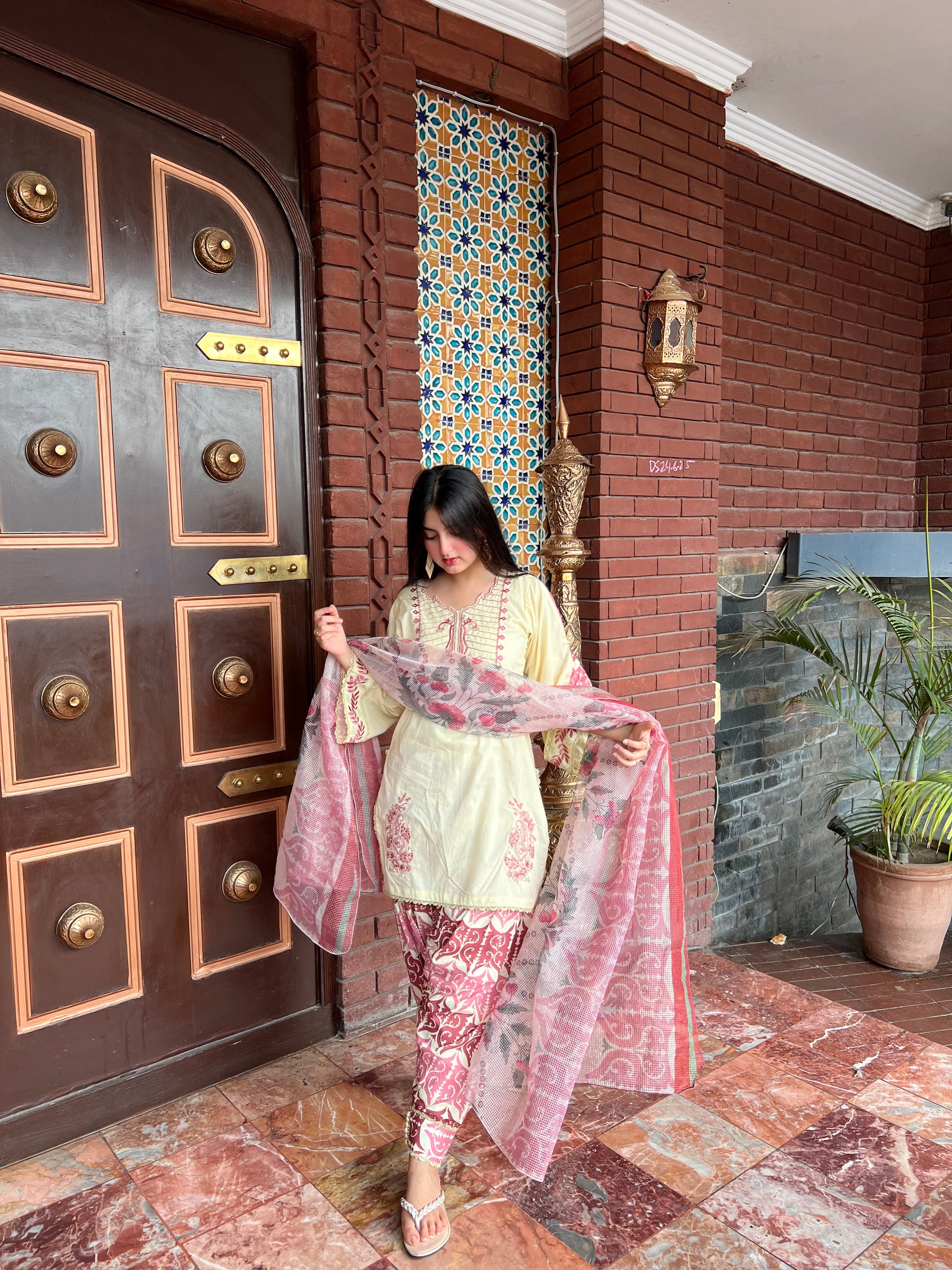 Elegant and fresh, Chaiseled by Aroshlay features a dyed lawn shirt with embroidered neckline, daman, and sleeves, paired with a microcheck printed dupatta and digitally printed cambric trouser.